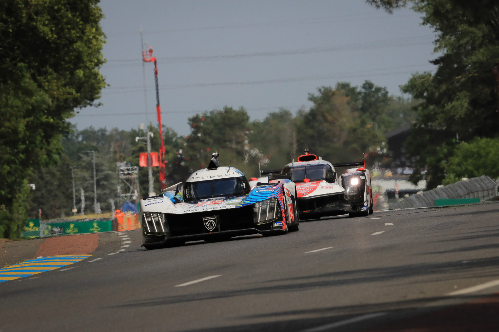 La première bataille oppose la Peugeot 9X8 #94 Peugeot TotalEnergies de Nico Müller et la Toyota GR010 Hybrid #8 de Ryō Hirakawa. Encore. La Peugeot qui découvre Le Mans est dans le rythme de la Toyota, victorieuse en 2021 et 2022. Mais une erreur de Gustavo Menezes (qui a pris la relève de Nico Müller) en tête à 3 h 09 fait partir la 9X8 du haut de la feuille de classement. Il abîme sa monture dans la chicane Daytona et doit couvrir le reste du tour avec une seule lumière fonctionnelle, et le demi-train avant droit qui frotte sur le bitume.
